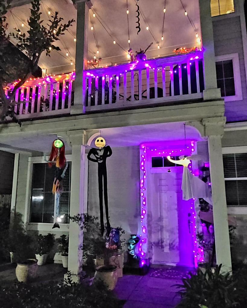 During prior years, all I did in terms of decorating my place for Halloween was to put up wooden plaques of Jack Skellington and Sally at my front door, display three plastic skeletons (cat, Dachshund dog, and a rat) on the railing around my second-floor balcony, and string up orange and purple lights on the balcony. Last year, I added a 6-foot-tall Jack Skellington, a matching Sally, and a matching Zero, all three of which hung near the front door entrance. My place really stood out because I was the only resident in my community who put up any Halloween decorations, but my friends and I really enjoyed seeing those decorations. This year, I will be adding another element which should be a lot of fun to have as part of the display.