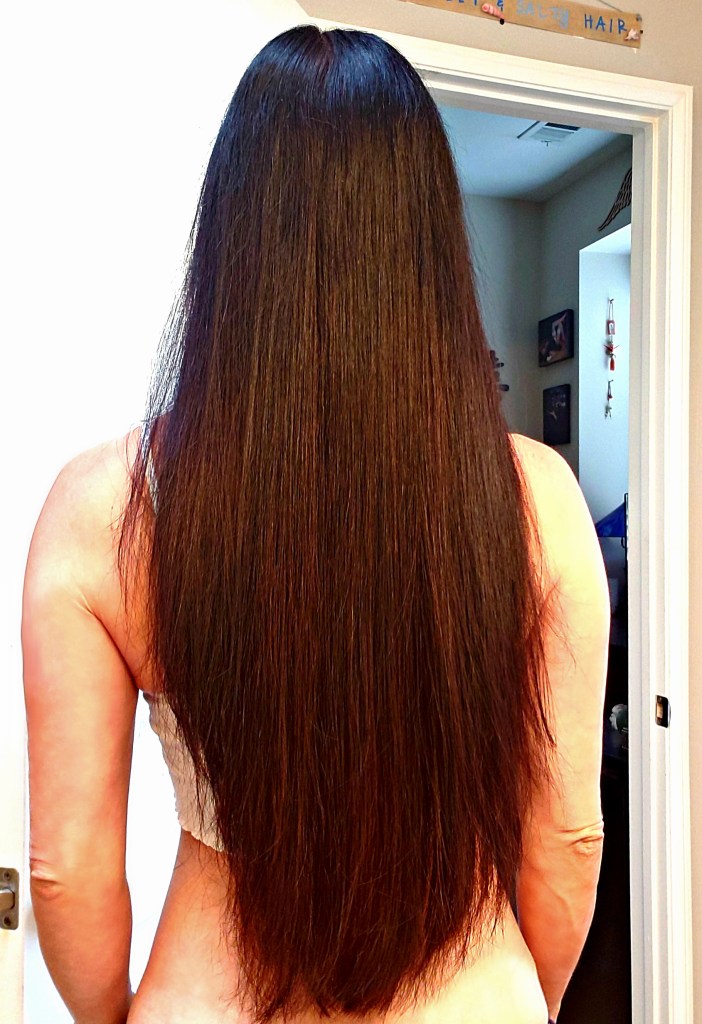 Once my hair was completely dry, I flat ironed my hair, taking small sections and running the flat iron 12 times through each section. The heat from the flat iron really kicked up the fumes, and my eyes began to water a bit, but I toughed it out. The result was incredibly smooth hair, without that nasty frizz I have been getting after washing my hair.
