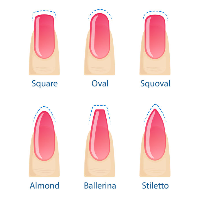 It seems like lots of ladies are opting to have their nails professionally done these days, and there are now an assortment of different nail shapes which one can choose. The six most popular nail shapes are shown in the above image, with Oval, Round, and Squoval nail shapes best suited for imparting the most natural look. You ca even create an optical illusion with your nail shape, so that if you have narrow, long fingers and want them to look more substantial, you can opt for the Squoval (or even Square, which has sharper angles) silhouette. Those with short or wide fingers who are willing to have a bit of length to their nails will find the Oval shape more flattering and slimming.