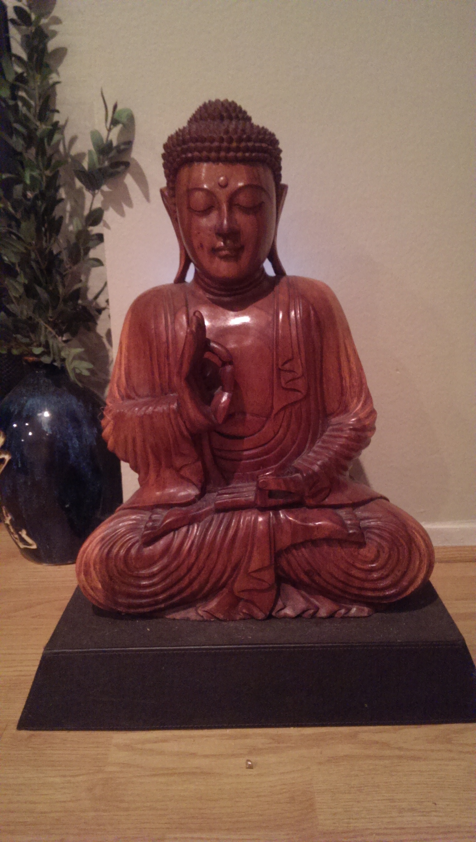 I have had this water fountain in my dining room since approximately 2008 and love the glow which the light casts on Buddha’s face. I remember seeing this fountain at a local garden center and just had to get it. Since I already had fountains outside, I decided to put it in the dining room, making sure to place it in a spot which was clearly visible from the living room as well. This isn’t a small tabletop fountain (it measures 27 inches high, 15-1/2 inches wide, and 7 inches in depth), so it definitely carries some visual impact.