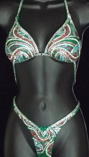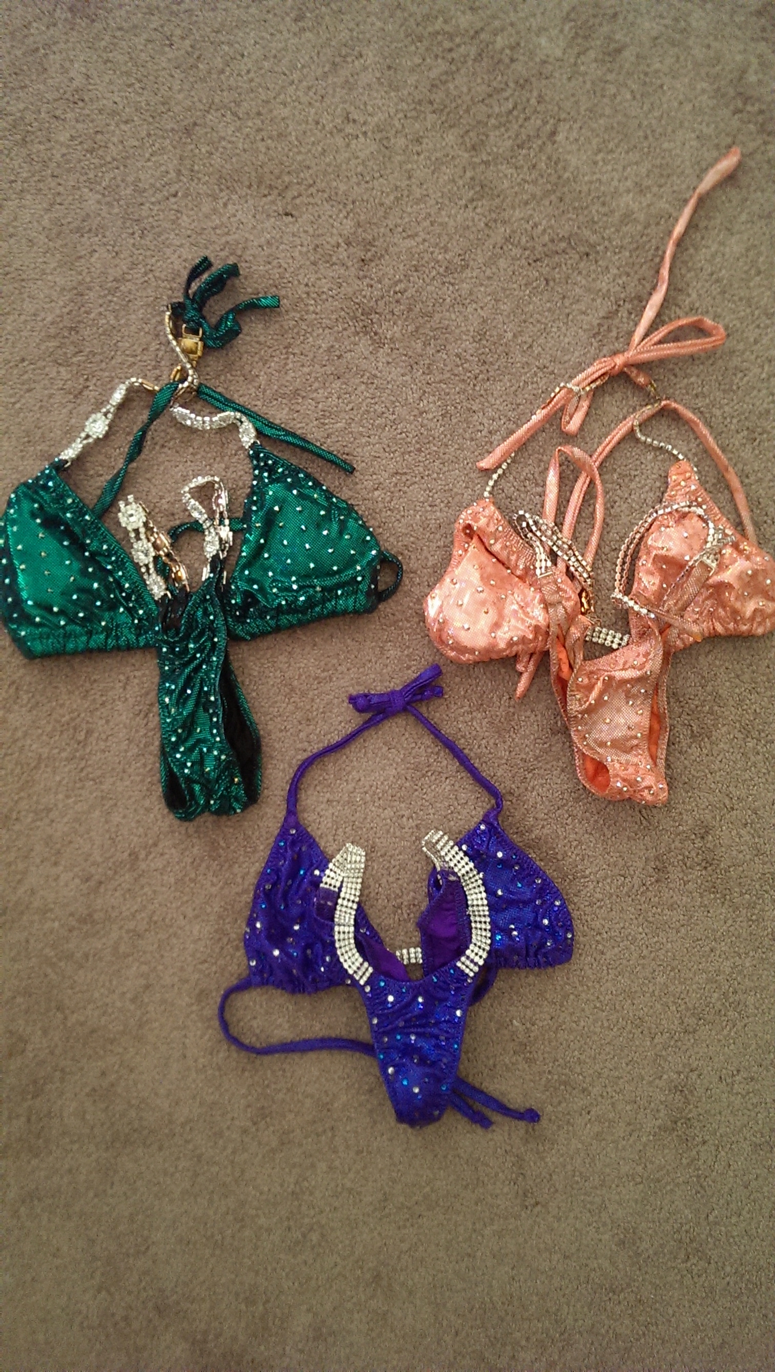 Competition suit designs can vary widely depending on the suit designer, fabric type, body measurements and proportions of the competitor. Though you may be tempted to go the cheaper route and either borrow or rent a suit or purchase an off the rack suit that is not made to fit your particular body, I always recommend having a suit custom made which is cut to your measurements. Trust me, it makes a huge difference when you wear a suit that compliments your body!