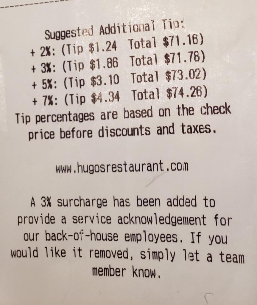 I went to a favorite local restaurant (Hugo’s Restaurant in Valley Village) earlier this month for brunch and was stunned by what I saw on the payment tablet and on my receipt. Things had already gone wonky because I had ordered a sparkling wine split ($12), but a server brought a carafe of orange juice for a mimosa. I had not ordered a mimosa ($15), so I did not touch the orange juice. The server also brought my friend orange juice for a mimosa, but she had ordered a hibiscus. So we had to contact our main server and ask for the correct type of juice.