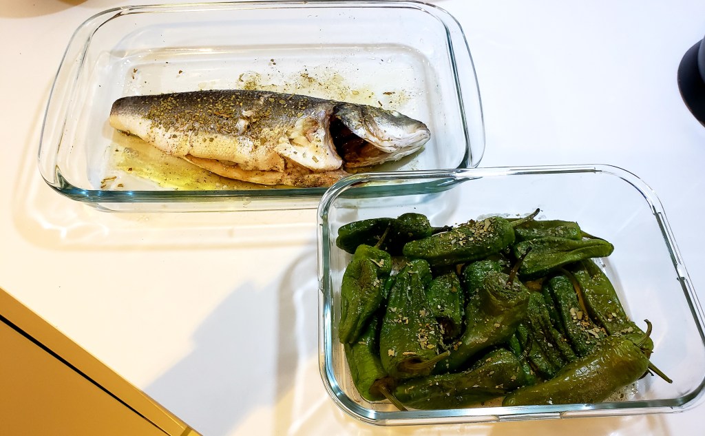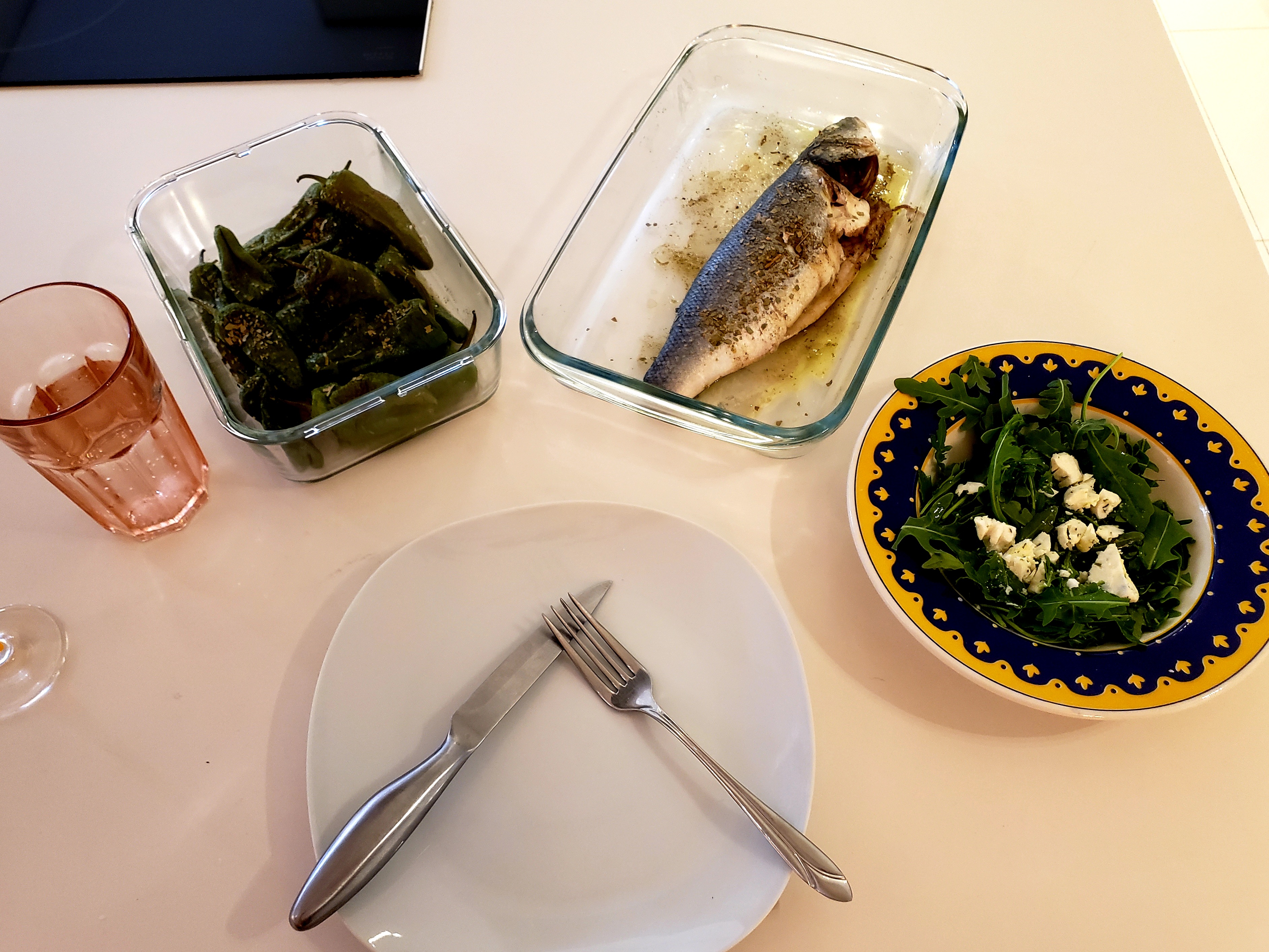 Agua con gas (sparkling water), roasted gernika peppers, baked branzino, arugula and goat cheese salad