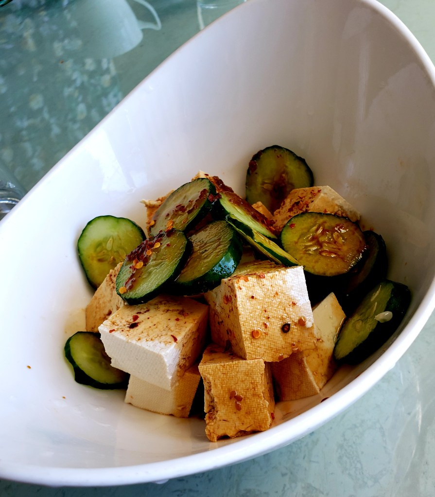 Cold tofu with cucumbers, soy sauce, and chili pepper flakes
